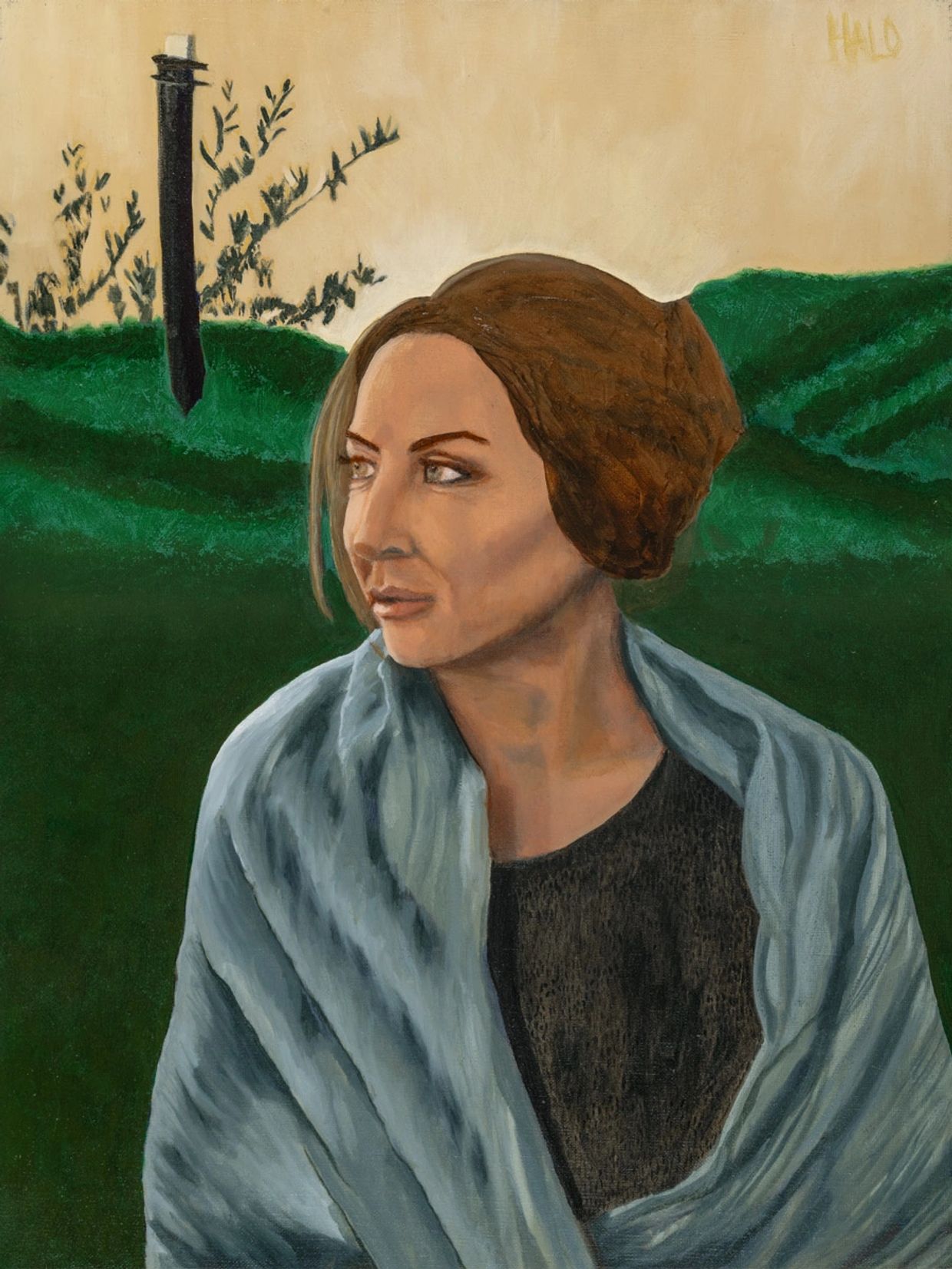 In this self-portrait, the artist reflects on identity, place, and inner stillness. Set against the rolling greens of Tuscany, the figure looks away from the viewer, as though caught between memory and possibility. Draped in soft blue, she appears contemplative, poised at the threshold of self-discovery. The landscape serves as both backdrop and metaphor—a reminder of how setting shapes the self, and how art becomes a mirror for the soul.